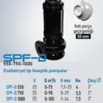 SPF-D 550,750,1000 serisi pompalar katı partikül içeren veya lifli atık suların transferi için dizayn edilmiş iki kanatlı kanal tip döküm çarklı pompalardır. Büyük katı madde içeren suların transferi için dizayn edilmiştir. Pompa tamamen akışkan içerisinde çalıştırılmalıdır. Elektrik motoru termistör korumalıdır. Kendinden flatörlüdür. Endüstriyel uygulamalar, kanalizasyon, drenaj, yağmur sularının tahliyesi, arıtma tesisleri, inşaat sektörü kullanım yerlerindendir.
