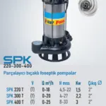 SPK Serisi pompalar, emişinde AISI 420 kalite paslanmaz çelik, hassas döküm teknolojisi kullanılarak üretilen parçalayıcı bıçak ısıl işlem uygulanarak sertleştirilmiş açık ( vortex ) döküm çarklı pompalardır. Sıvı içerisinde bulunan katı maddeleri boruyu tıkamayacak boyutlarda parçalayarak hem pompanın hem de tesisatın ömrünü uzatır. Pompa tamamen akışkan içerisinde çalıştırılmalıdır. Elektrik motoru, termistör korumalıdır. Pompa, elektrik panosu ile birlikte kullanılmalıdır.