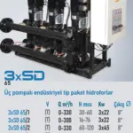 Üç pompalı paket hidroforlar ortak bir kaide üzerine montajı yapılan her pompanın emme hattında vana basma hattında çek valf, basınç şalteri, manometre bulunan hidroforlardır. Hidroforlarda kullanılan elektrik kumanda panosunda faz hatası, faz sırası kontrolü ve susuz çalışmaya karşı 5 m seviye